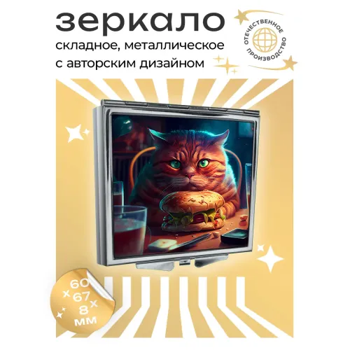 Складное зеркало квадратной формы с изображением кота. Сувенирный аксессуар.