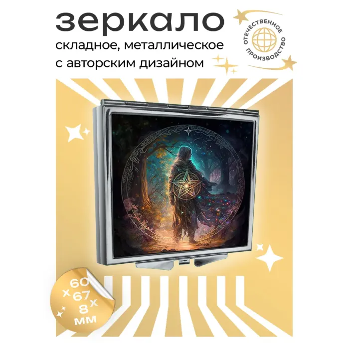 Складное квадратное зеркало для личного использования. Материалы: металл и стекло. Конструкция складная, с полноцветным изображением на металле.