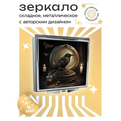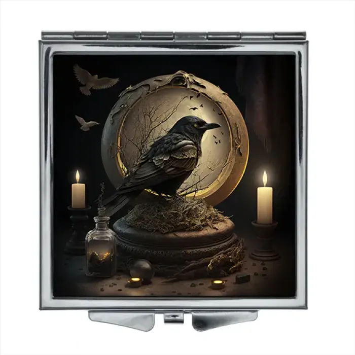 Складное зеркало квадратной формы для личного использования, выполнено из металла и стекла с полноцветной печатью изображения ворона.