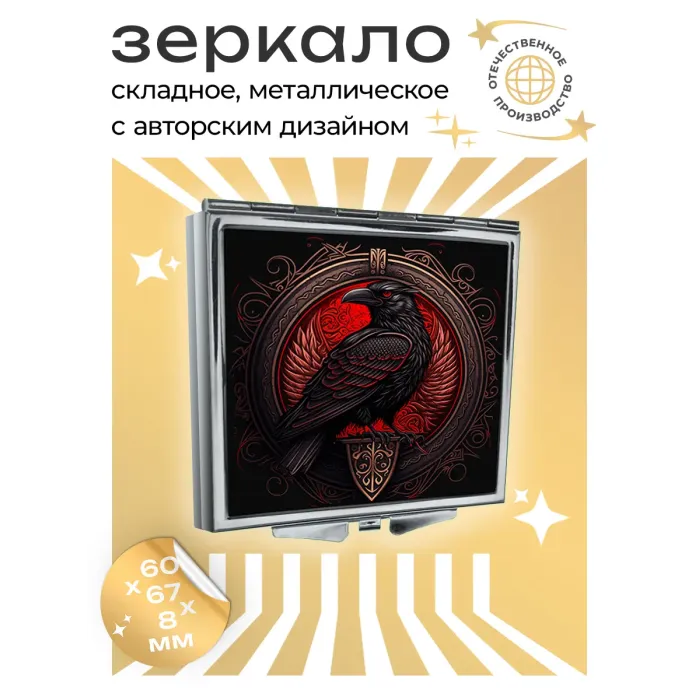 Складное квадратное зеркало с полноцветным изображением на металлической основе.