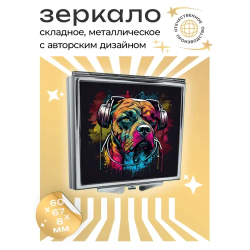 Складное зеркало квадратной формы с изображением пса. Изготовлено из металла и стекла.