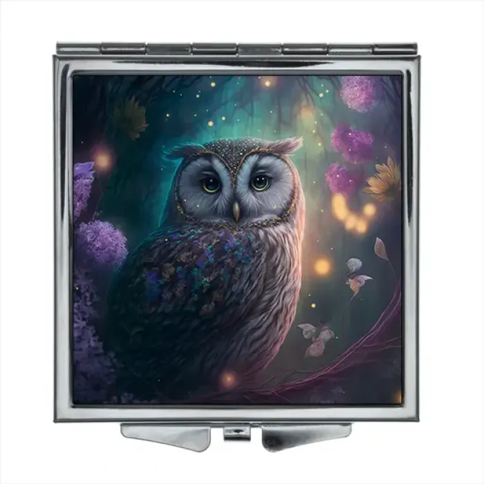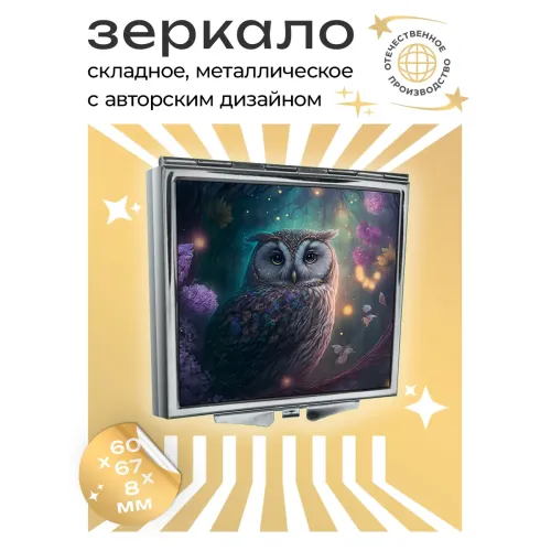 Складное зеркало квадратной формы с изображением филина. Изготовлено из металла и стекла.