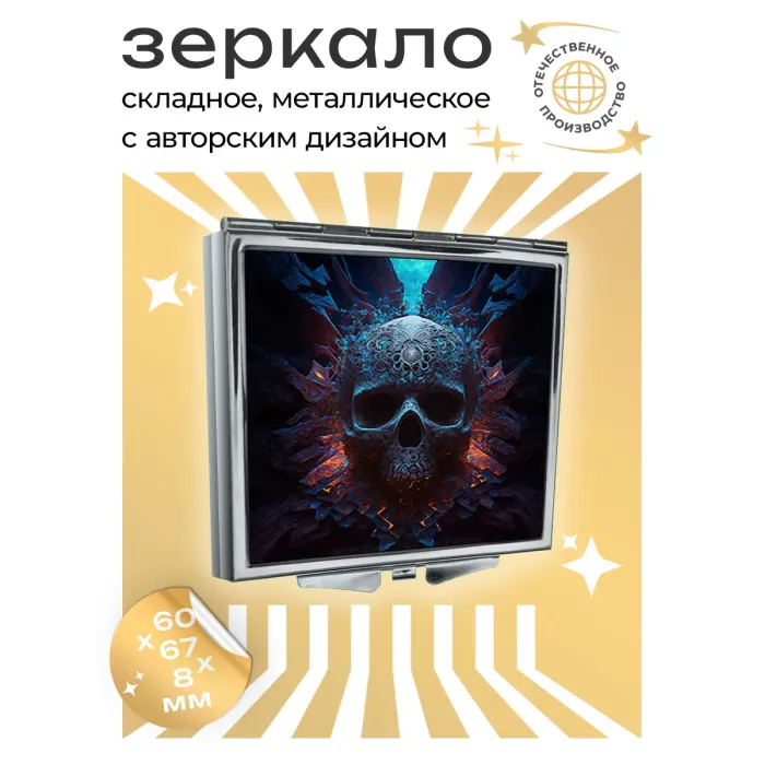 Складное зеркало квадратной формы с изображением черепа. Изготовлено из металла и стекла.