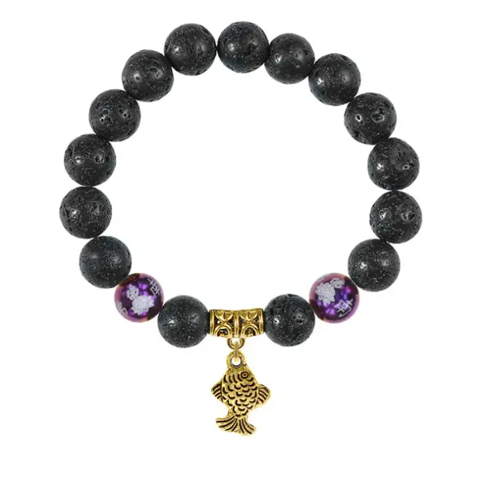 Браслет-амулет из натурального камня лава с фарфоровыми бусинами и подвеской в виде рыбки.
