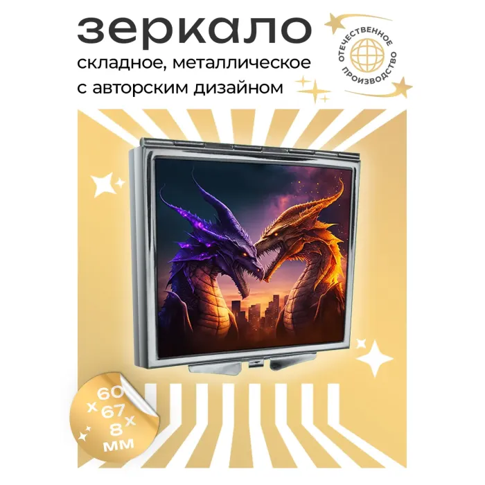 Складное зеркало квадратной формы с изображением драконов. Изготовлено из металла и стекла.