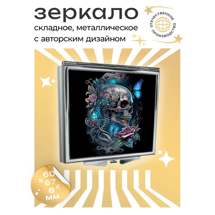 Складное зеркало квадратной формы с изображением черепа. Изготовлено из металла и стекла.