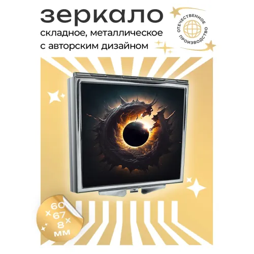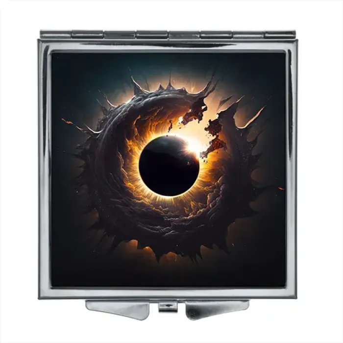 Складное квадратное зеркало с полноцветной печатью изображения «Чёрная дыра» на металлической поверхности.