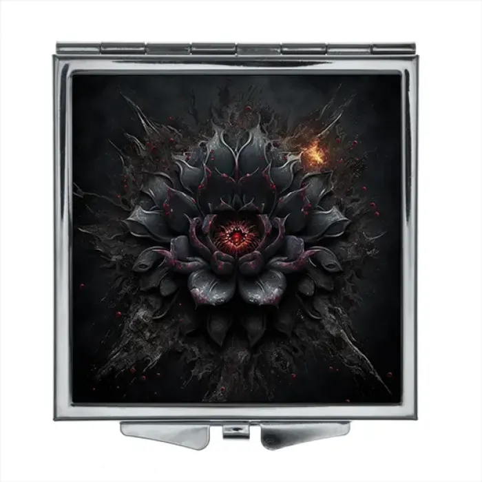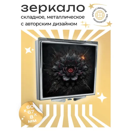 Складное зеркало квадратной формы с изображением лотоса. Изготовлено из металла и стекла.