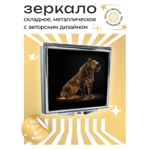 Складное зеркало квадратной формы с изображением тигра. Материал — металл и стекло.
