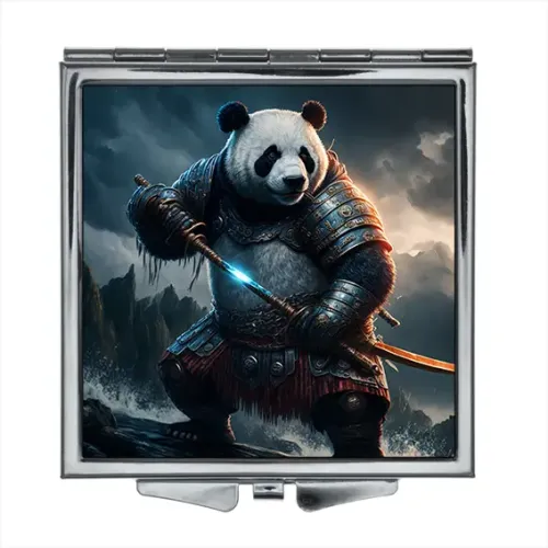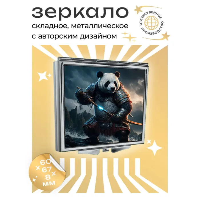 Складное квадратное зеркало с полноцветным изображением панды на металлической поверхности.