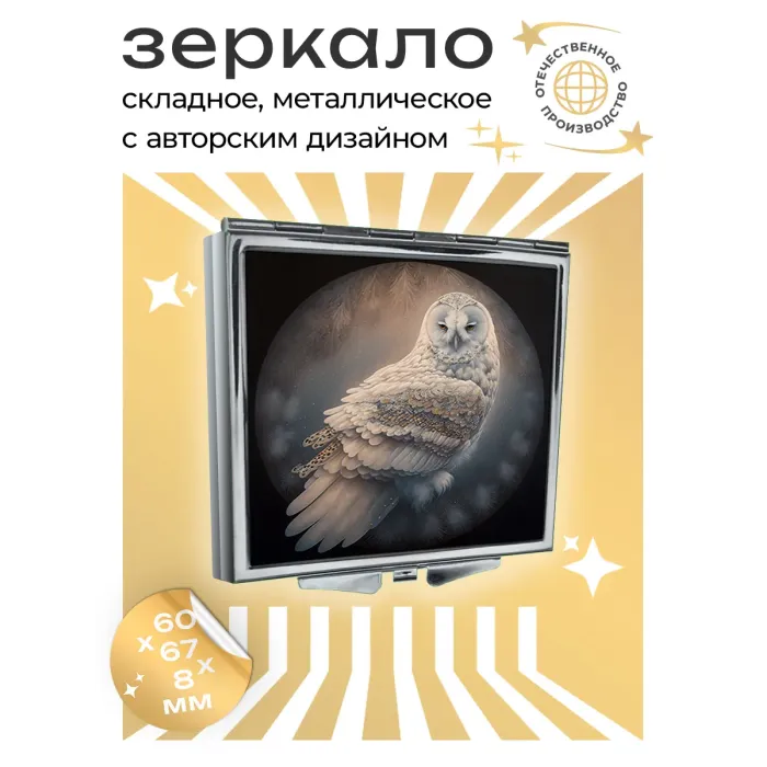 Складное зеркало квадратной формы с изображением совы. Изготовлено из металла и стекла.