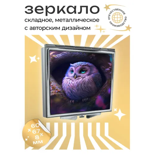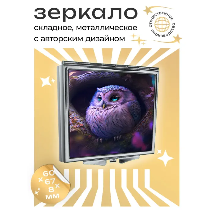 Складное зеркало квадратной формы с изображением совы. Материалы: металл и стекло.