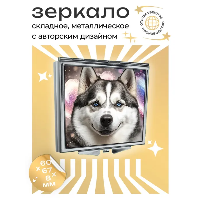 Складное квадратное зеркало с изображением собаки породы хаски.