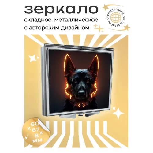 Складное зеркало квадратной формы с изображением собаки. Изготовлено из металла и стекла.