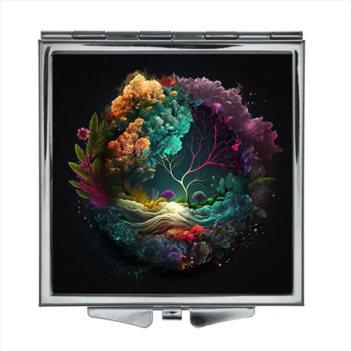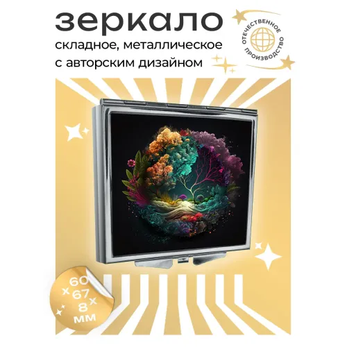 Складное зеркало квадратной формы с полноцветным изображением. Изготовлено из металла и стекла.