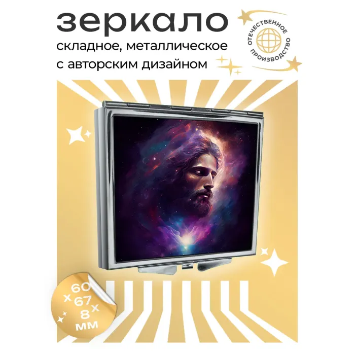 Складное квадратное зеркало с изображением Иисуса. Изготовлено из металла и стекла.