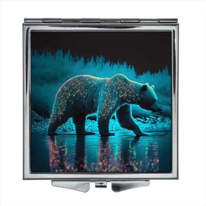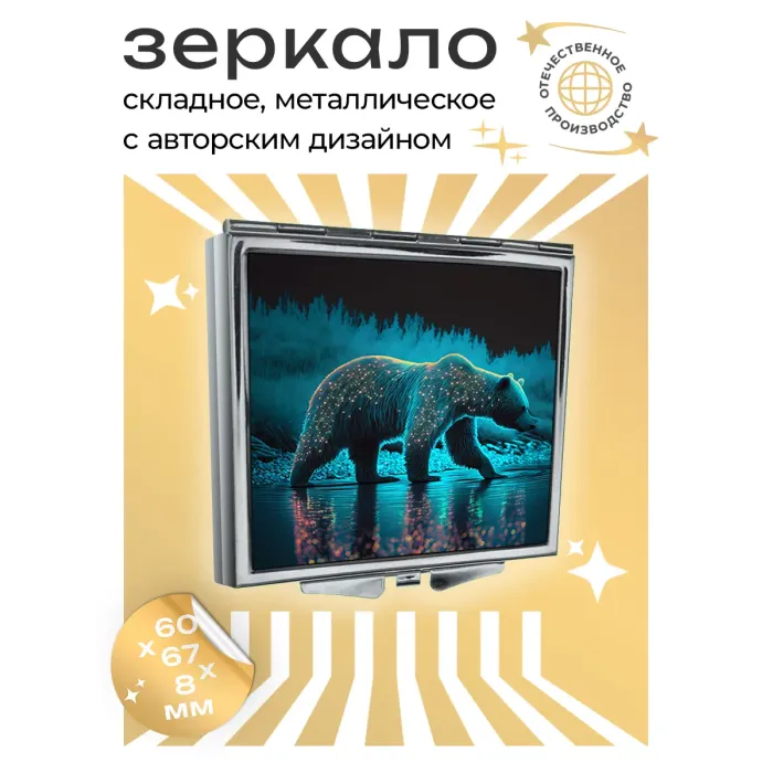 Складное зеркало квадратной формы с изображением медведя. Материалы: металл и стекло.