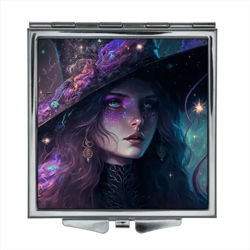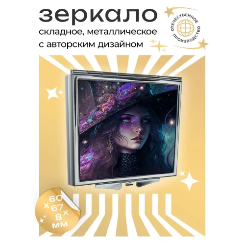 Складное квадратное зеркало с полноцветным изображением ведьмы на металлической основе.