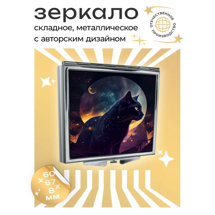 Складное зеркало квадратной формы с изображением кота. Материалы: металл и стекло.