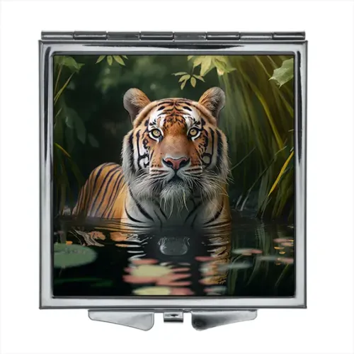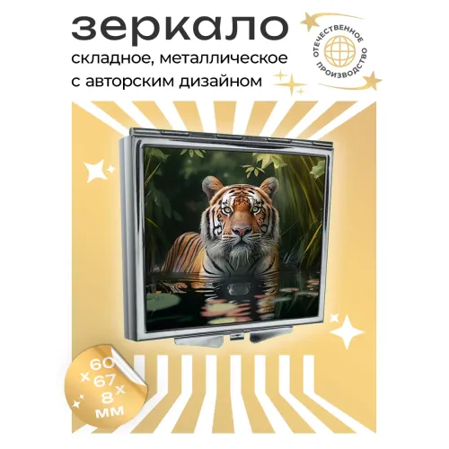 Складное квадратное зеркало с изображением тигра. Изготовлено из металла и стекла.