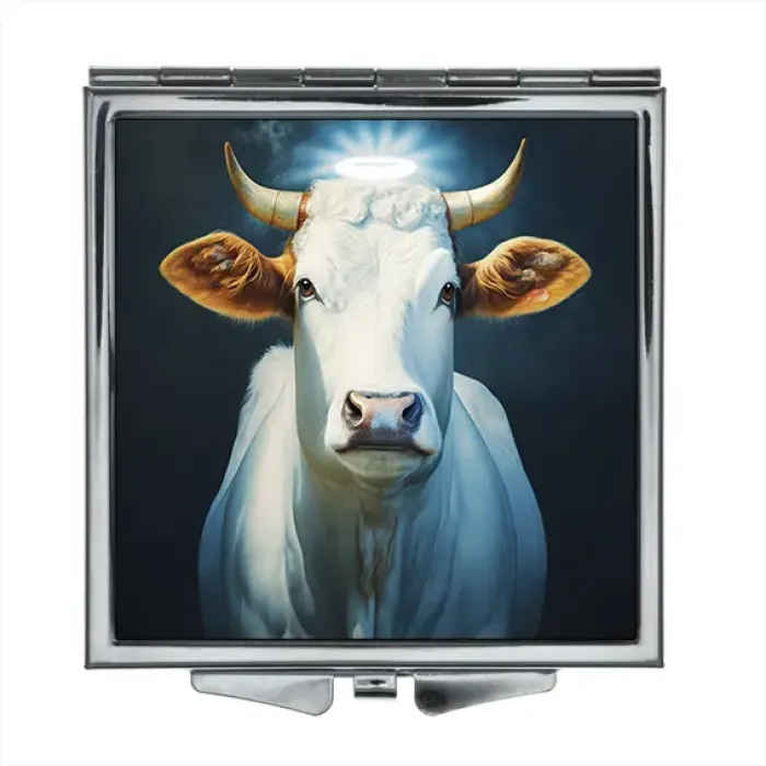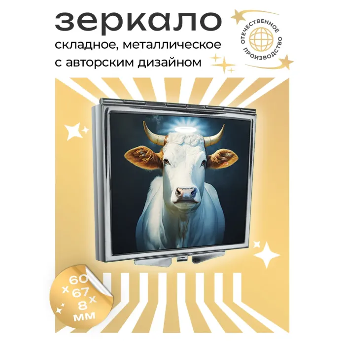 Складное квадратное зеркало с полноцветным изображением «Священная корова» на металлической основе.