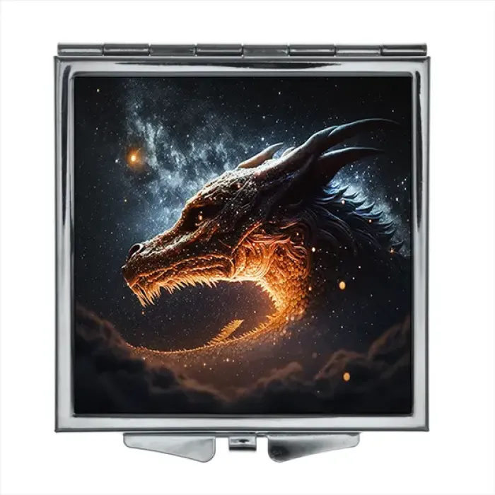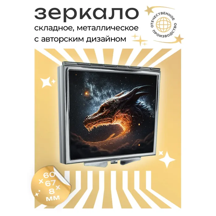 Складное зеркало квадратной формы с изображением дракона. Изготовлено из металла и стекла.