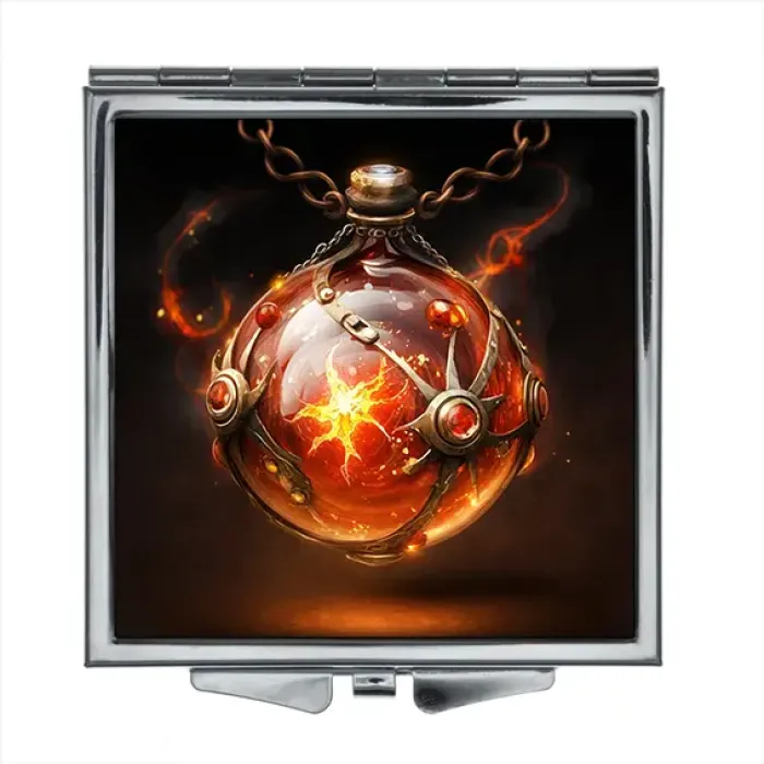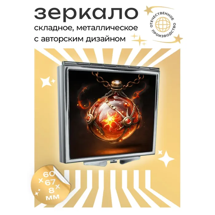 Складное зеркало квадратной формы с полноцветным изображением на металлической основе.