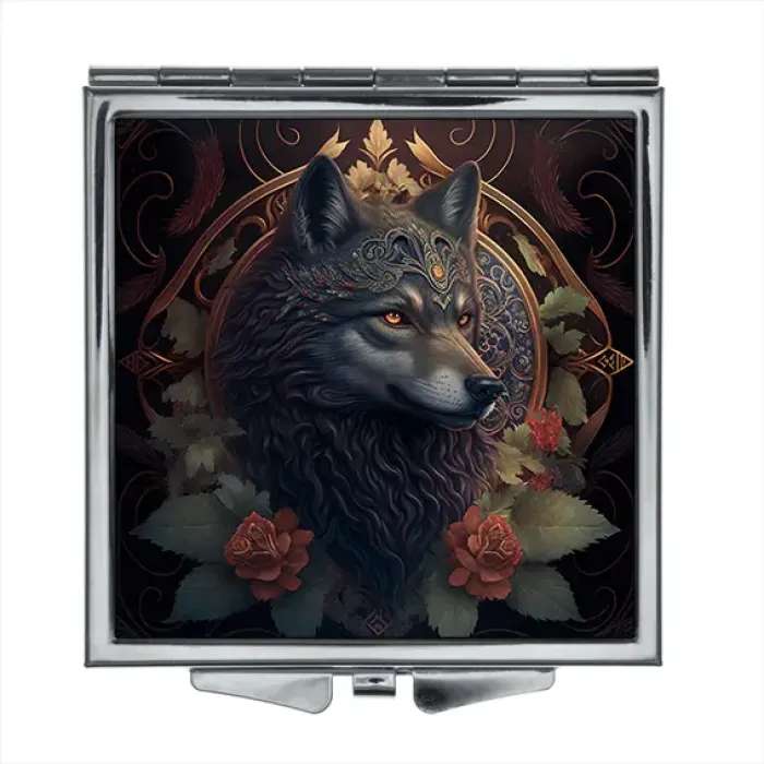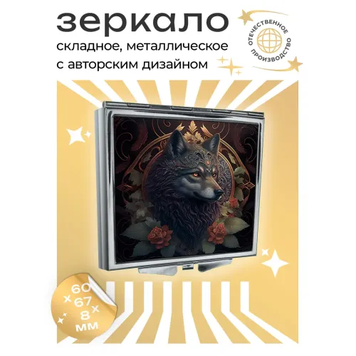 Складное зеркало квадратной формы с изображением волчицы. Материалы: металл, стекло.