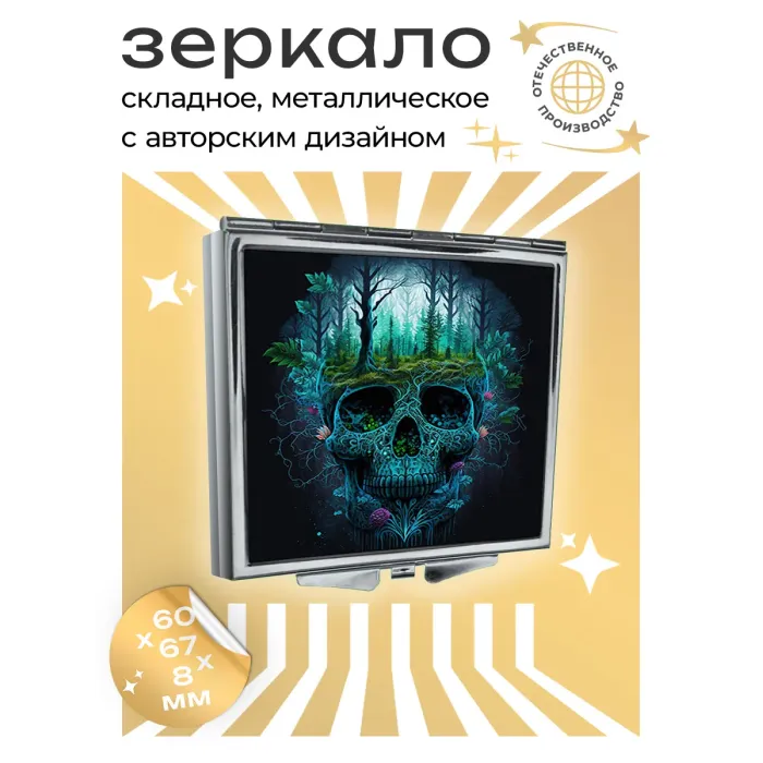 Складное зеркало квадратной формы с изображением черепа. Изготовлено из металла и стекла.