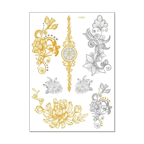 Временная татуировка-переводка с металлическим блеском, имитирующая узоры мехенди или украшения.