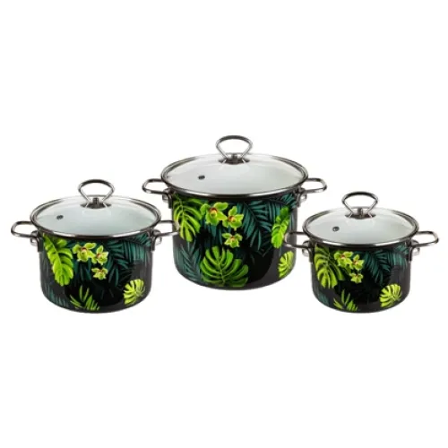Набор эмалированной посуды «Тропическая ночь-5-1-Элит» состоит из трёх цилиндрических кастрюль и предназначен для приготовления пищи. Кастрюли имеют эмалевое покрытие, которое обеспечивает гигиеничность и устойчивость к повреждениям, а также яркий декоративный рисунок.