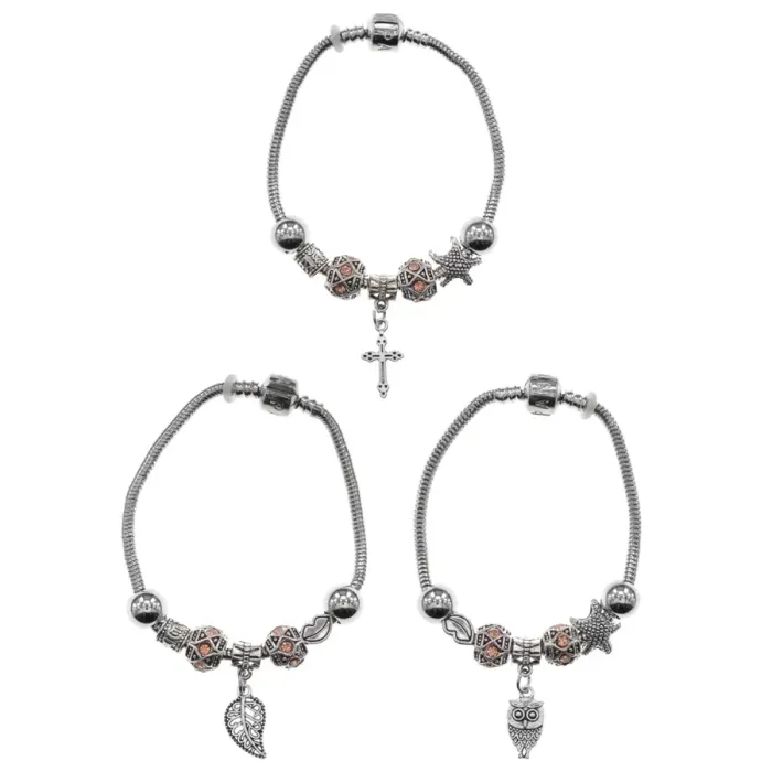 Браслет в европейском стиле из бижутерного сплава с бусинами, подвесками и стразами.