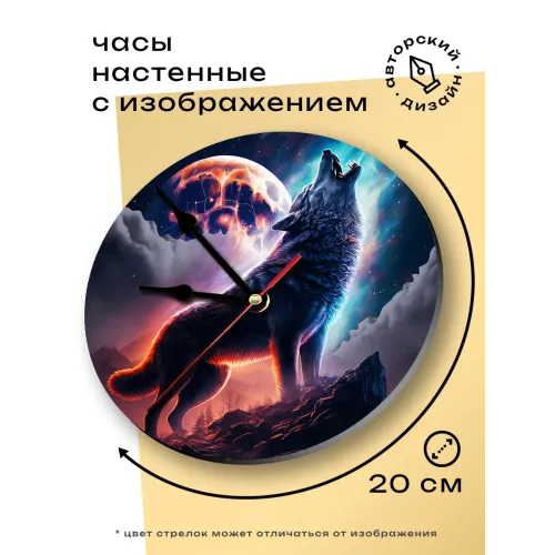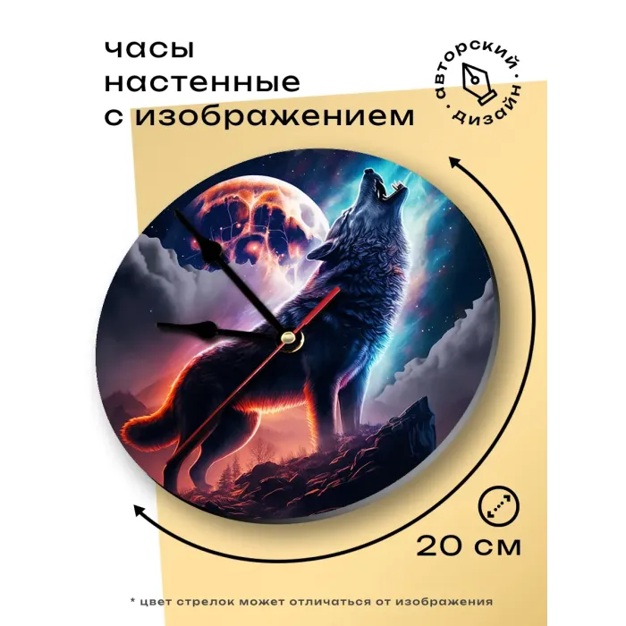 Настенные часы с изображением волка в полнолуние. Материал — вспененный пластик ПВХ, изображение нанесено методом наклейки.