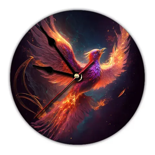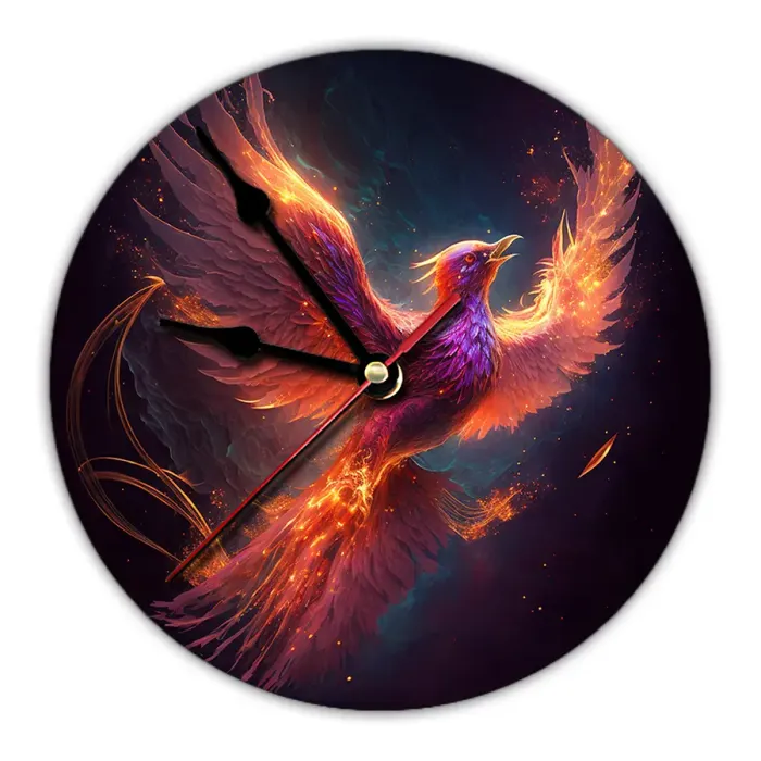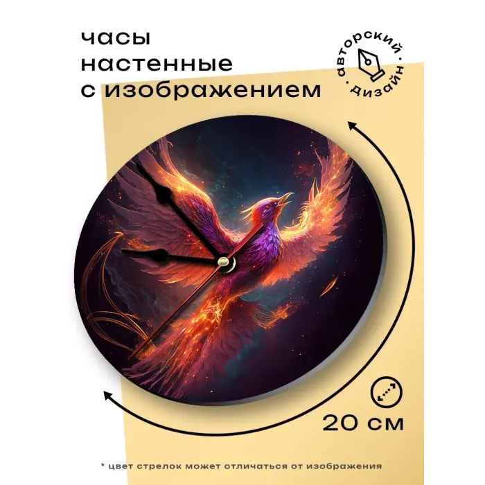 Настенные часы с изображением феникса. Циферблат диаметром 20 см изготовлен из вспененного пластика ПВХ, изображение нанесено методом наклейки.