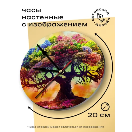 Настенные часы с изображением древа жизни. Циферблат диаметром 20 см выполнен из вспененного пластика ПВХ, изображение нанесено методом аппликации.