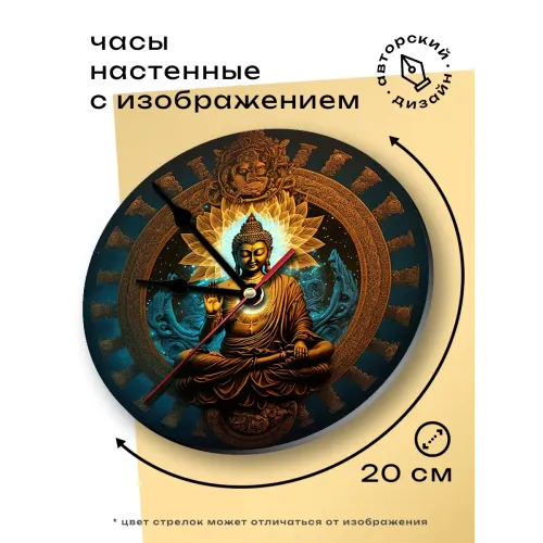 Настенные часы с изображением Будды. Циферблат диаметром 20 см выполнен из вспененного пластика ПВХ, изображение нанесено методом аппликации.