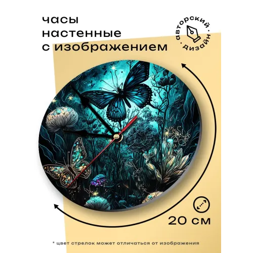 Настенные часы с циферблатом диаметром 20 см. Материал корпуса — вспененный ПВХ. Дизайн украшен изображением бабочек.