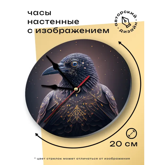Настенные часы с изображением ворона. Циферблат диаметром 20 см выполнен из вспененного пластика ПВХ, изображение нанесено методом аппликации.