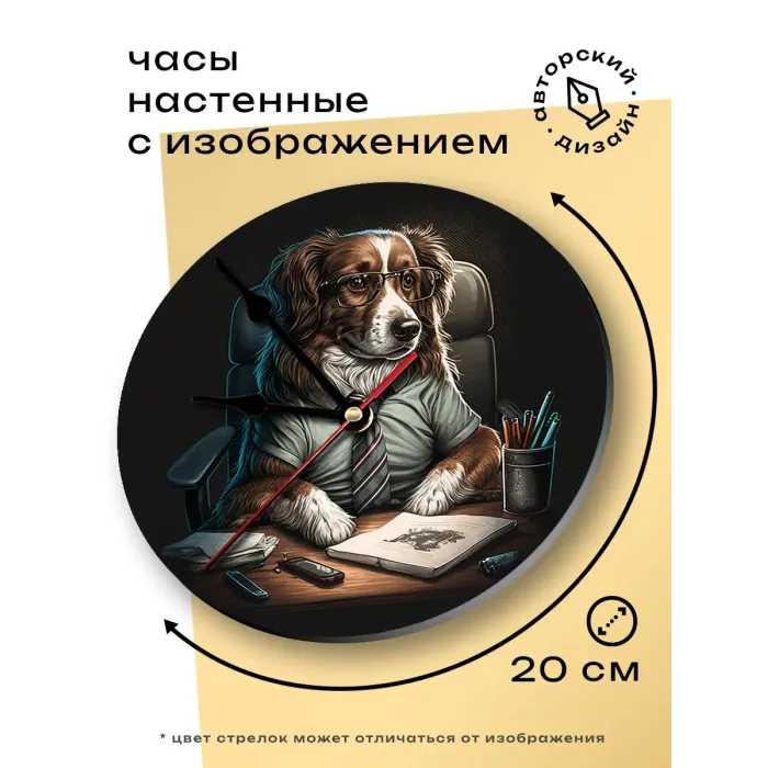 Настенные часы с изображением собаки. Циферблат диаметром 20 см выполнен из вспененного пластика ПВХ.