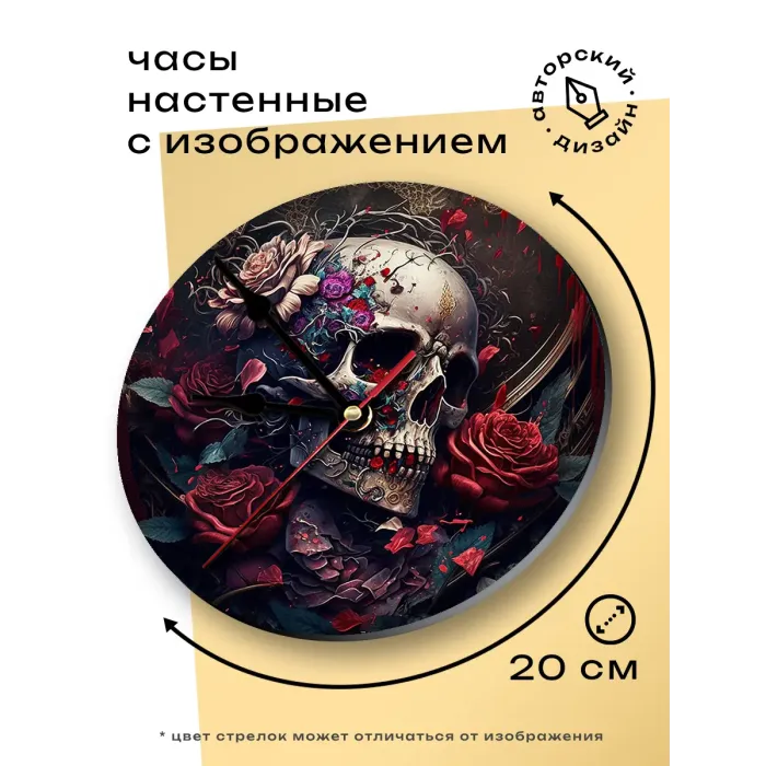 Настенные часы с циферблатом в виде черепа. Материал — вспененный пластик ПВХ, изображение нанесено методом аппликации.