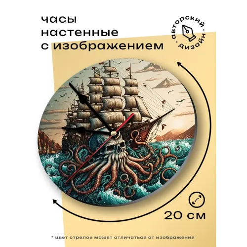 Настенные часы с изображением кракена и парусника. Циферблат диаметром 20 см выполнен из вспененного пластика ПВХ.