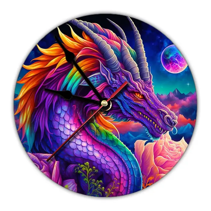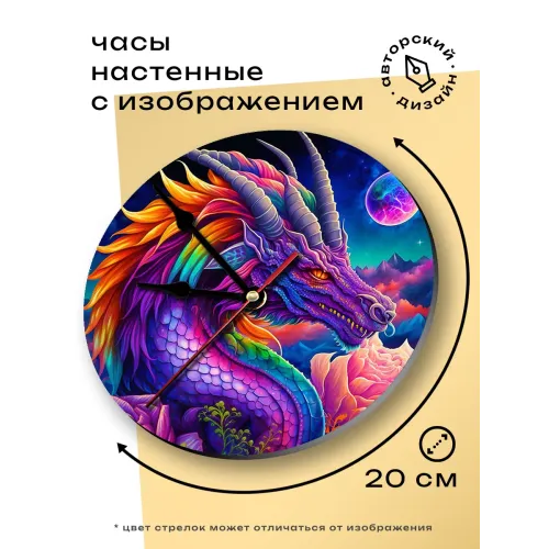 Настенные часы с изображением дракона. Циферблат диаметром 20 см изготовлен из вспененного пластика ПВХ, изображение нанесено методом наклейки.