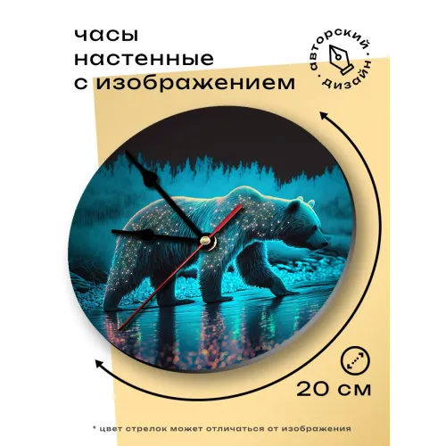 Настенные часы с изображением медведя. Циферблат диаметром 20 см выполнен из вспененного пластика ПВХ.