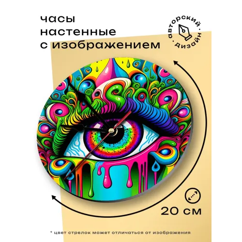 Настенные часы с циферблатом диаметром 20 см. Материал — вспененный пластик ПВХ. Дизайн выполнен в виде изображения глаза.