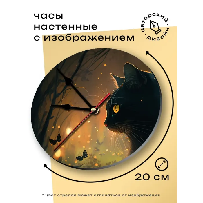 Настенные часы с изображением кошки и бабочек. Циферблат диаметром 20 см выполнен из вспененного пластика ПВХ.