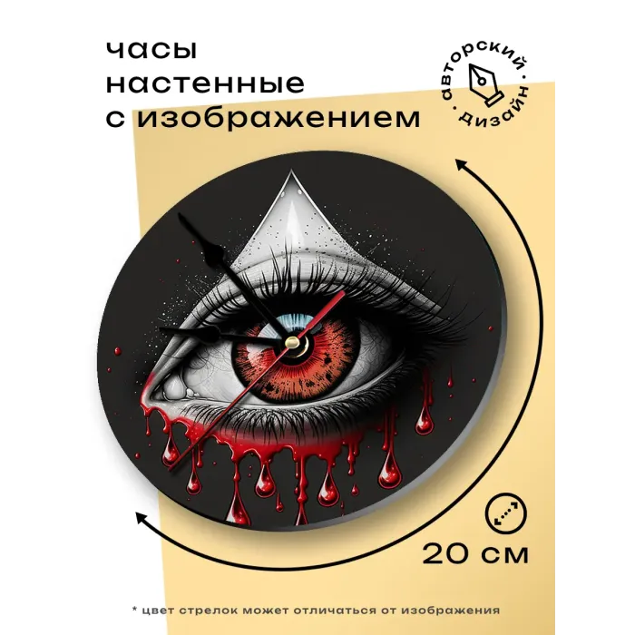 Настенные часы диаметром 20 см с изображением глаза. Циферблат изготовлен из вспененного пластика ПВХ, дизайн нанесён методом аппликации.