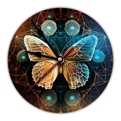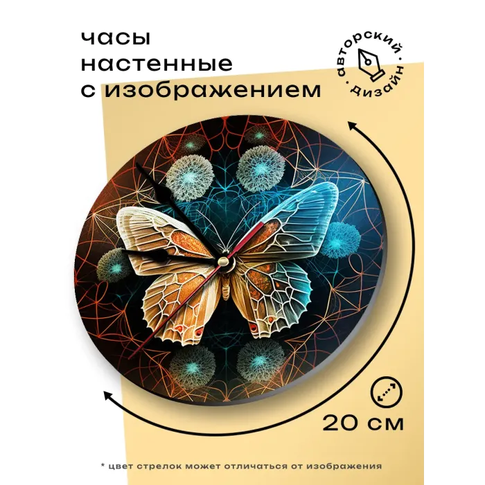 Настенные часы с циферблатом в форме бабочки диаметром 20 см. Материал — вспененный пластик ПВХ, изображение нанесено наклейкой.