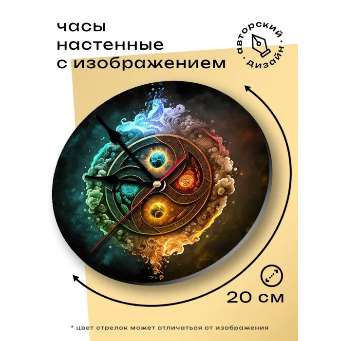 Настенные часы "4 стихии" — это оригинальный элемент декора, который привнесет в любое пространство атмосферу гармонии и вдохновения. Циферблат диаметром 20 см выполнен из лёгкого вспененного пластика ПВХ, что обеспечивает долговечность и легкость установки. Часы имеют петлю для подвешивания на стену и оформлены методом наклейки, что позволяет создать яркий акцент в интерьере.