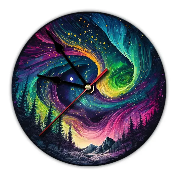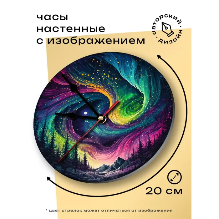 Настенные часы с изображением северного сияния. Циферблат диаметром 20 см выполнен из вспененного пластика ПВХ, оснащён петлёй для крепления.