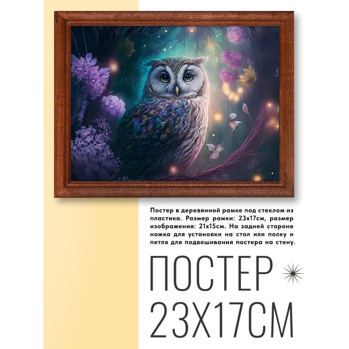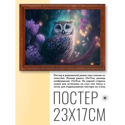 Постер в рамке с изображением совы. Рамка деревянная, изображение защищено пластиковым стеклом.